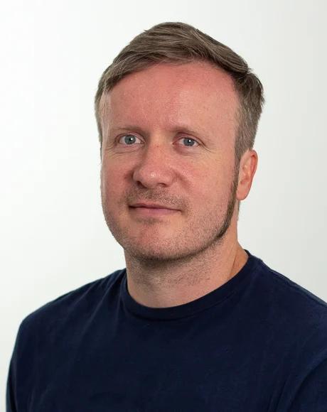 Portrett av en mann med kort, brunt hår og blå øyne, iført en mørkeblå t-skjorte. Hvit bakgrunn.